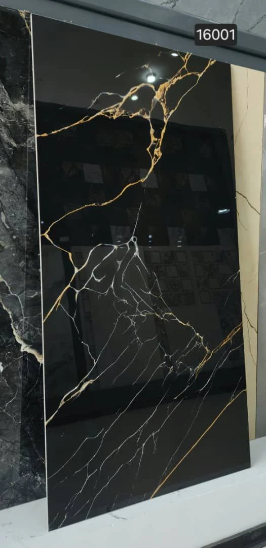بورسلين رخامي أسود خالص بعروق ذهبية وبيضاء موديل 16001