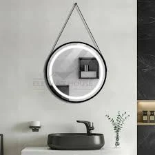 مرآة دائرية معلقة بإطار أسود نحيف تحتوي على مصباح LED مدمج